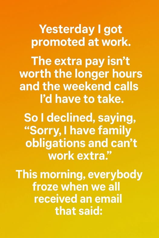 This journey taught me that integrity is its own form of ambition. By honoring the commitments I made to my family, I inadvertently showcased a quality more valuable to my company than mere availability. The right opportunity isn’t always the one that offers the most; it’s the one that takes the least from you. Saying no to the wrong promotion was the very act that made me visible for the right one, proving that sometimes, the bravest career move is to protect the life you have outside of it.