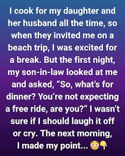 Cooking is my love language. For my daughter and her husband, I’ve prepared countless Sunday dinners, pouring care into every soup and pie. When they invited me on a beach vacation, I saw it as a wonderful opportunity to connect without an apron. I dreamed of lazy days by the ocean, but reality had a different plan. On our first evening, my son-in-law jokingly asked what I was making for dinner, adding with a laugh, “You’re not expecting a free ride, are you?” The remark hit a deep chord. It wasn’t just about the meal; it was about the invisible labor I provided being taken for granted.